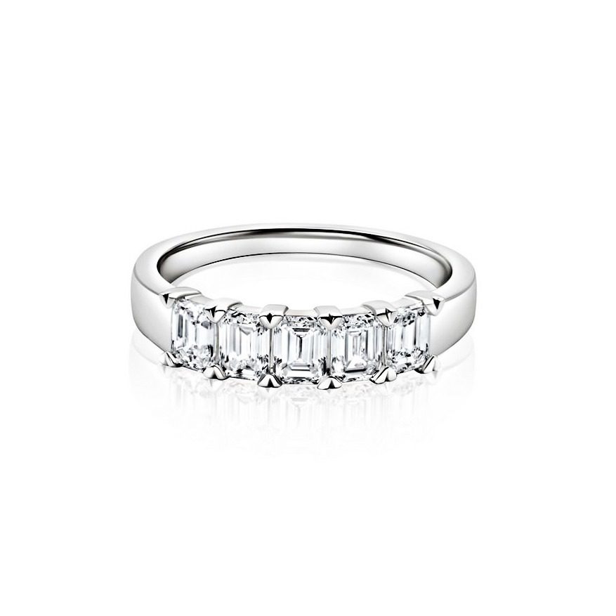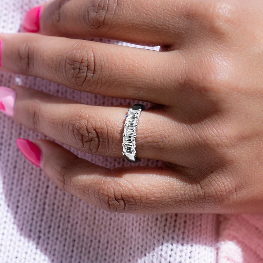 The diamonds are arranged in a sleek emerald style setting, known for its elegant lines and structured appearance. This setting enhances the natural beauty of each diamond while allowing light to flow through for enhanced sparkle. The band offers a comfortable fit while maintaining a polished, luxurious profile on the finger.